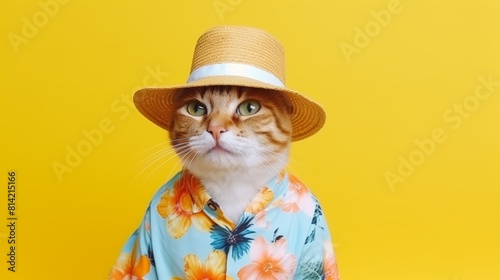 A cat wearing a straw hat and a hawaiian shirt is looking at the camera with a serious expression.