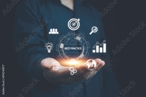 Businessman pressing Best Practice, Business, Technology, Internet and network concept. Best practice.Best practice concept. Manager (businessman, coach, leadership) plan to apply best practice method