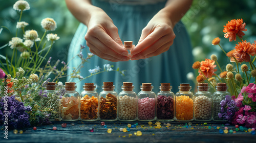 An artistic representation of a homeopathic medicine consultation, with the practitioner carefully selecting individualized remedies based on the patient's unique symptoms and cons
