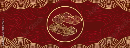 chinese style pattern background, red and gold lines, simple Chinese wave texture pattern with circular auspicious cloud decoration in the center of the screen.
