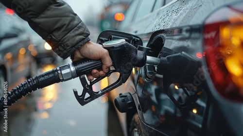 Hand refilling the car with fuel at the refuel station. Generative AI