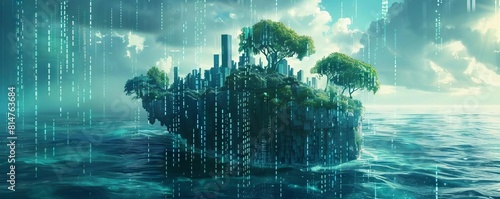 A tranquil yet fortified depiction of a blockchain island surrounded by a digital moat in a vast ocean of data