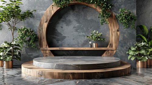 Elegant Wooden Podium Platform with Carved Circle Design for Product Display or Showcase
