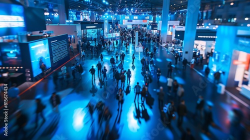 IT congress hustle and bustle, focus on a big demo booth in the centre of the picture, IT security, Developer, Recruiting, Innovations, blue light, binary code, long exposure captures blurred movement