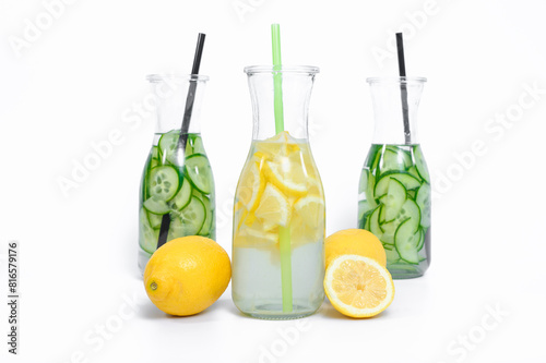 Orzeźwiająca woda w szklanej karafce, połączenie świeżego ogórka z kwaśna cytryną