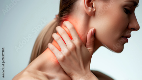Side view of a woman with neck pain, she is touching the painful parts, highlighted in red, with her hand