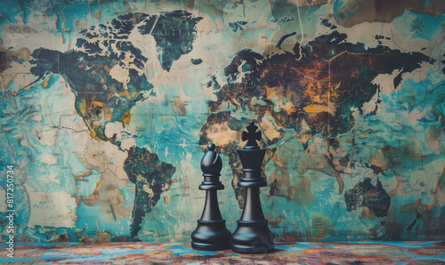 The concept of geopolitics shows two chess pieces placed on a world map, suggesting well-thought-out international strategies and maneuvers.