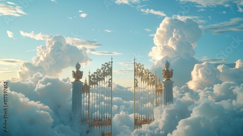 Heavenly scene featuring a close-up of a golden gate, set high amongst fluffy clouds, visualizing the promise of life after