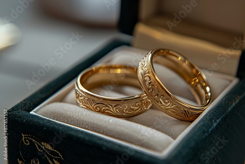 Two gold wedding bands in a jewelry box on a table
