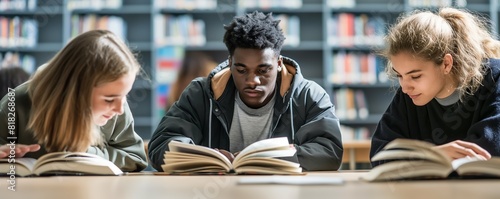 Group of diverse students studying in a library