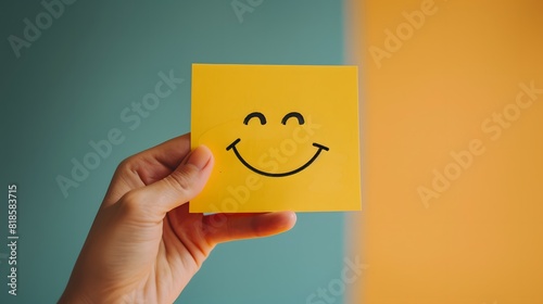 A hand holds a yellow paper with a smiley face on it against a solid colored background, representing a positive and happy concept of customer service experience.