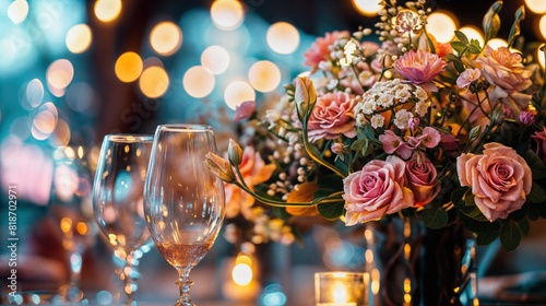 Na bliskim planie widać obrus na drewnianym stole, na którym stoi wazon z kwiatami