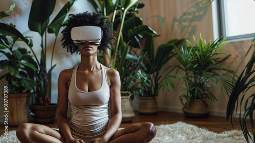Kobieta siedząca w pozycji jogi, nosząca okulary do wirtualnej rzeczywistości, w trakcie praktykowania medytacji i skupienia
