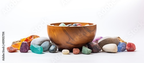 tibetan singing bowl and multicoloured healing chakra stones isolated on white background. copy space available