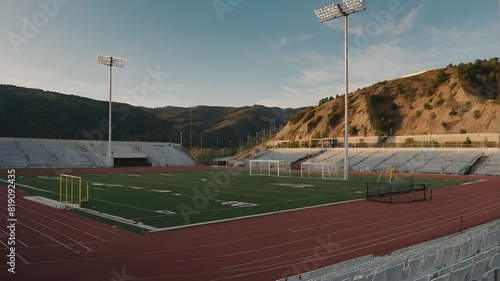 close-up of a football stadium with an artificial goal, a hillside athletics field