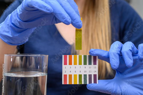 Sprawdzać pH wody z kranu, papierek lakmusowy zanurzony w wodzie i przykładany do skali