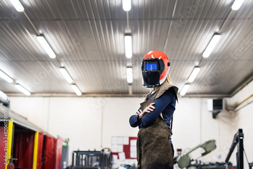 Beautiful blonde woman works as a welder in workshop, operating welding machine, wearing protective clothing and a welding mask.