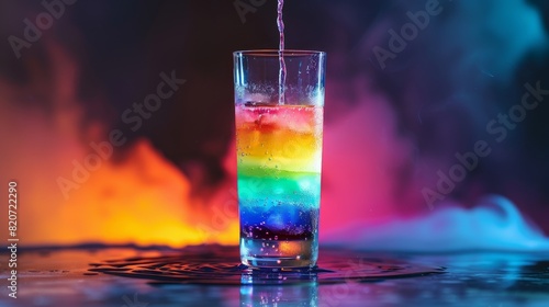 Captivating scene of a rainbow cocktail creation, with each layer of color vividly pouring into a tall glass, set in a subdued lighting environment for dramatic effect
