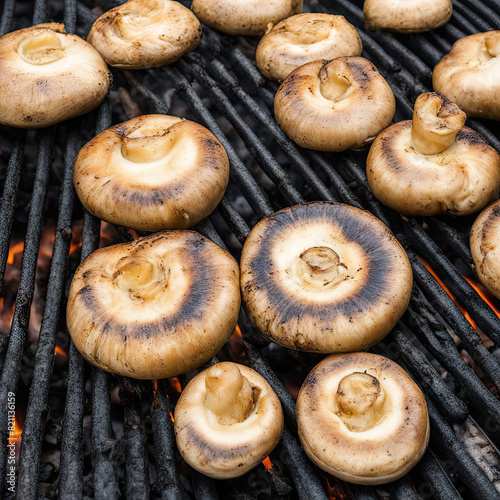 aromatic juicy champignons are cooked in the open air on the grill. mushrooms lie over the coals