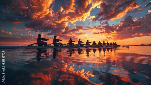 Skilled rowers sync strokes perfectly beneath a dramatic sunset, creating a harmonious rhythm.