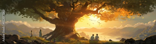 Beautiful sunset over a giant ancient tree, with people admiring the view and a serene landscape in the background.
