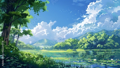 An illustration depicting a serene natural landscape with pleasant weather conditions.