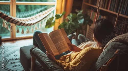 Comfortable reading scene with a young woman engrossed in a book in an armchair, flanked by greenery and natural light.