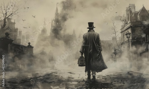 Victorian gentleman with a money bag, foggy street, worms eye view, steampunk ink drawing