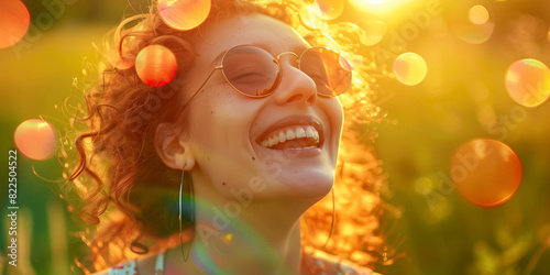 Image focuses on sparkling sunlight effects around a young girl in nature, whose face is smiling