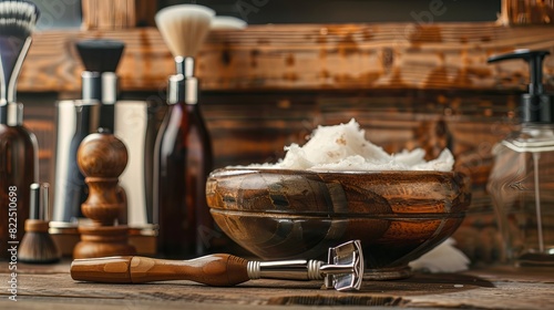 Old-style men's shaving accessories: safety and straight razors, brush, and shaving soap for home use.