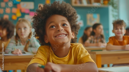 The students in the elementary school classroom are laughing and listening to their teacher as he or she gives a lesson. Happy young kids are writing in exercise notebooks after a funny incident.