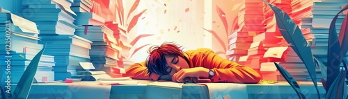 Monotonous Desk Job A illustration figure slumped over a cluttered desk with stacks of paperwork