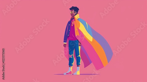 An illustration of a 2D flat style character representing bisexual pride, with a flag draped around their shoulders. The character stands against a clean background, highlighting the pride colors.