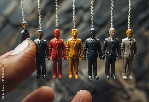 A manually manipulated image depicts a lineup of multiple businessmen, symbolizing the concept of controlling business strategy and planning through manipulation.