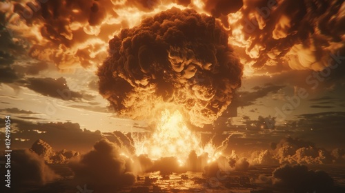 A terrible atomic explosion with immense shock waves, the horizon consumed by a towering mushroom cloud, fiery glow dominating the scene