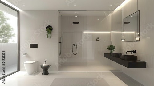 Minimalist bathroom with sleek black fixtures, a floating vanity, and a frameless glass shower enclosure