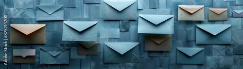 Modern mail concept, a series of geometrically aligned envelopes on a blue textured background, showcasing order and connectivity