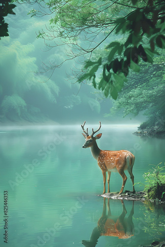 Majestic Deer by Foggy Lake in Serene Forest Setting