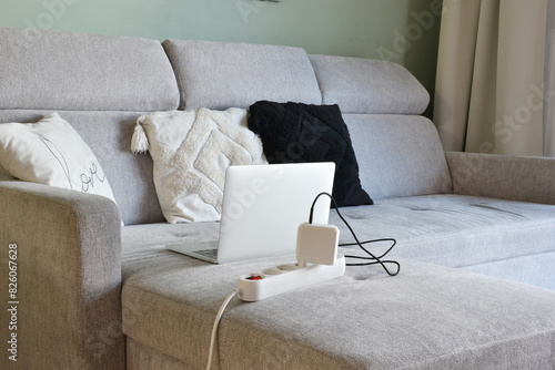 Biały przedłużacz na sofie w domu ładujący laptopa