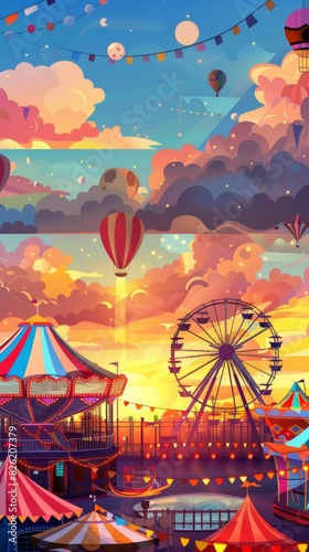 Vector background of amusement park. Poster design invitation of the carnival funfair and amusement with sunset. Ferris wheel, roller coaster and carousel festive parks attractions.