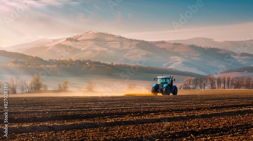 A modern tractor at work, plowing the fields during sunset, creating a dynamic rural scene