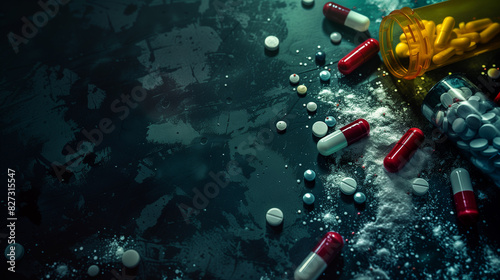 Illegal drugs concept with heroin powder and pills on dark background, top view