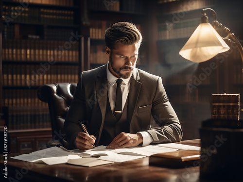 A hipster-styled photo captures a young lawyer's focused dedication to legal proceedings in court
