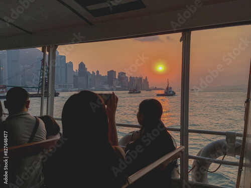 Panoramic skyline silhouette view of Hongkong Hong Kong Victoria Harbor and port infrastructure bay scenic landscape seascape scenery during twilight blue hour in China