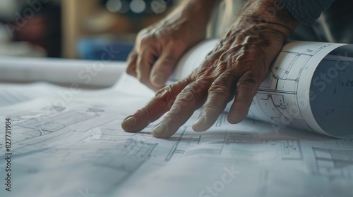 A close-up of a construction blueprint being unrolled on a table, with hands holding the edges.