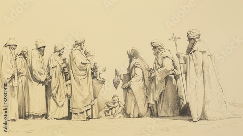 Magi Visit Baby Jesus, Star of Bethlehem, Biblical Illustration, Beige Background, Copyspace