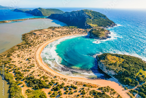 Aerial view of voidokilia beach, lagoon with beaches in mediterranean, Ionian Sea, Pylos town , Greece. Navarino Castle on hill.
