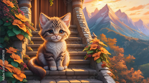 Mały kot, kotek siedzi na schodach przed wejściem do domu