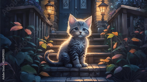 Mały kot, kotek siedzi na schodach przed wejściem do domu