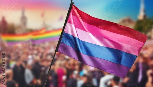 bisexual flag on the background of the pride parade, lgbt pride month, fight against homophobia, tolerance, rally of many people